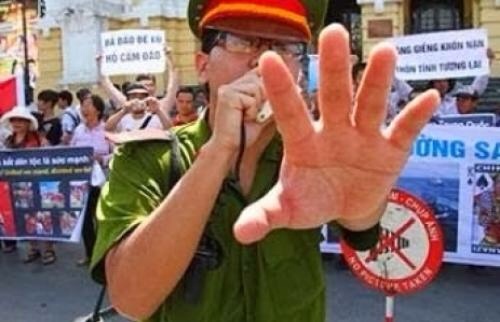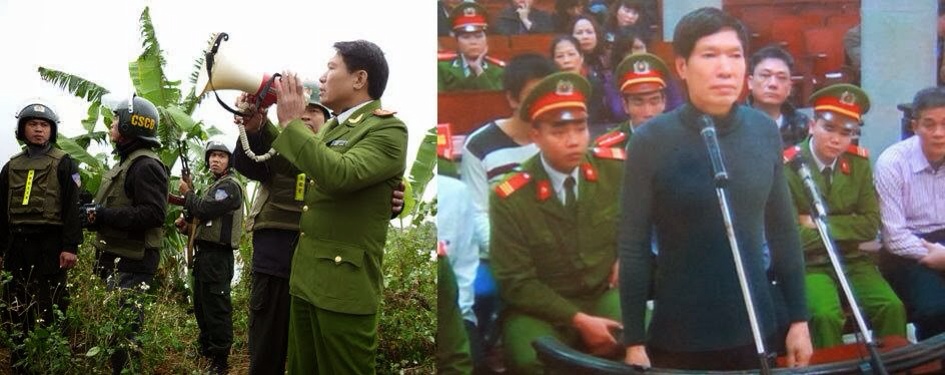 Dương Tự Trọng cầm loa kêu gọi anh em anh Vươn đầu hàng lúc tham gia tấn công cướp đất nhà anh Đoàn Văn Vươn và Dương Tự Trọng đứng trước tòa hôm nay – Ảnh và chú thích của Nguyễn Lân Thắng.