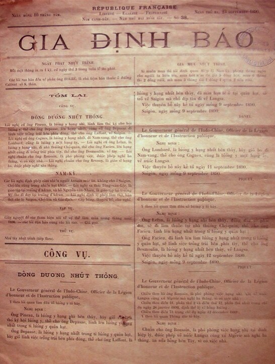 Mở đầu giai đọan này là việc ra đời của tờ Gia Định báo số 1 ngày 1-4-1865 và sống được ít nhất đến ngày 25-10-1909, lúc đầu mỗi tháng xuất bản 1 lần, rồi tháng 2 lần, sau cùng là hàng tuần. Một tờ báo đầu tiên ở nước ta bằng chữ Quốc ngữ ! Thực ra đó là một thứ công báo do Chính quyền Pháp thời đó ở Nam Kỳ trao quyền điều hành cho ông Ernest Potteaux, đến năm 1869 trao cho ông Petrus Joannes Baptista Trương Vĩnh Ký quản lý[21]. Trương Vĩnh Ký (1837-1898) đọc và nói được 15 sinh ngữ và cổ ngữ Tây phương, viết tới 121 cuốn sách (đã xuất bản dưới 100 cuốn) về nhiều lãnh vực, bằng các tiếng Việt, Pháp, Hoa, Campuchia, Indoustan, Tamoul, Myanmar, Thái Lan, Lào, Chăm, nhiều nhất là bằng chữ Quốc ngữ. Trương Vĩnh Ký cổ động cho việc học mới, khuyến khích dân chúng học Quốc ngữ [22]. Ông cũng sọan ra sách Vần tập đọc ; theo gương Trương Vĩnh Ký, các ông Huỳnh Tịnh Của, Trương Minh Ký, Nguyễn Văn Hai, Cao Đình Nam … cũng cho ra đời những cuốn Vần tập đọc.