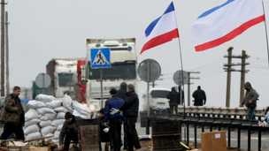 Những người tự xưng là dân quân địa phương đứng gác đoạn đường dẫn vào Crimea