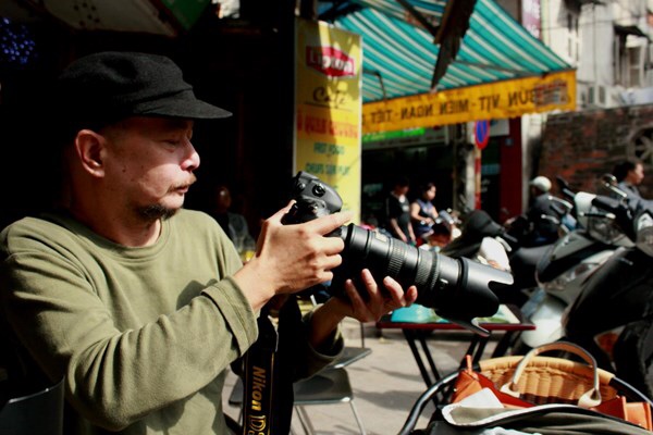 Đến buổi hẹn cùng tôi, anh đạp xe địa hình, đầu đội mũ bêrê, trên vai là chiếc máy ảnh quen thuộc.