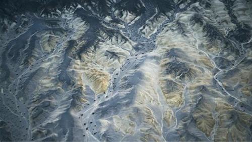 Bức hình chụp từ trên cao cho thấy những mảng màu nâu xám đầy bí ẩn và đe dọa.