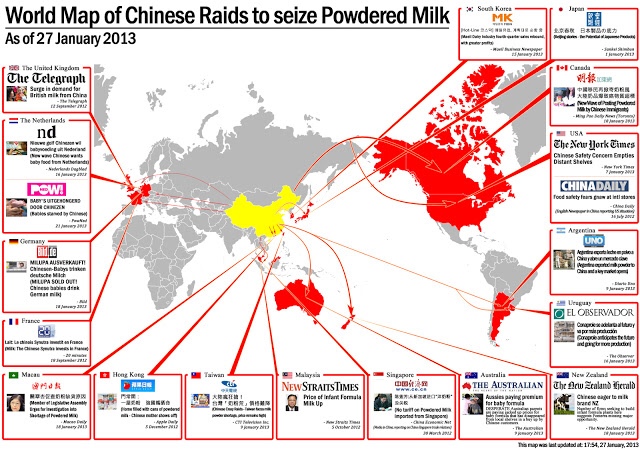 Như báo chí châu Âu và Mỹ , Úc v.v… mấy tuần qua liên tục đăng bài cảnh báo việc người Trung quốc ra sức gom sữa trên khắp các cửa hàng ở châu Âu và các quốc gia phương Tây để đưa về Trung quốc và nay cả quả tươi vì những người có chút tiền ở Trung quốc không dám ăn quả tươi, thịt lợn, gà, vịt và uống sữa, sản phảm làm ra tại chính quốc gia mình. Người ta cho rằng những sản phẩm sữa Trung Quốc vẫn chưa khôi phục được niềm tin người tiêu dùng sau vụ tai tiếng năm 2008 nay chẳng những chưa ngưng mà có khả năng kém phẩm chất và độc hại cao hơn vì không tin vào sự minh bạch của các thông tin nhà nước đưa ra.
