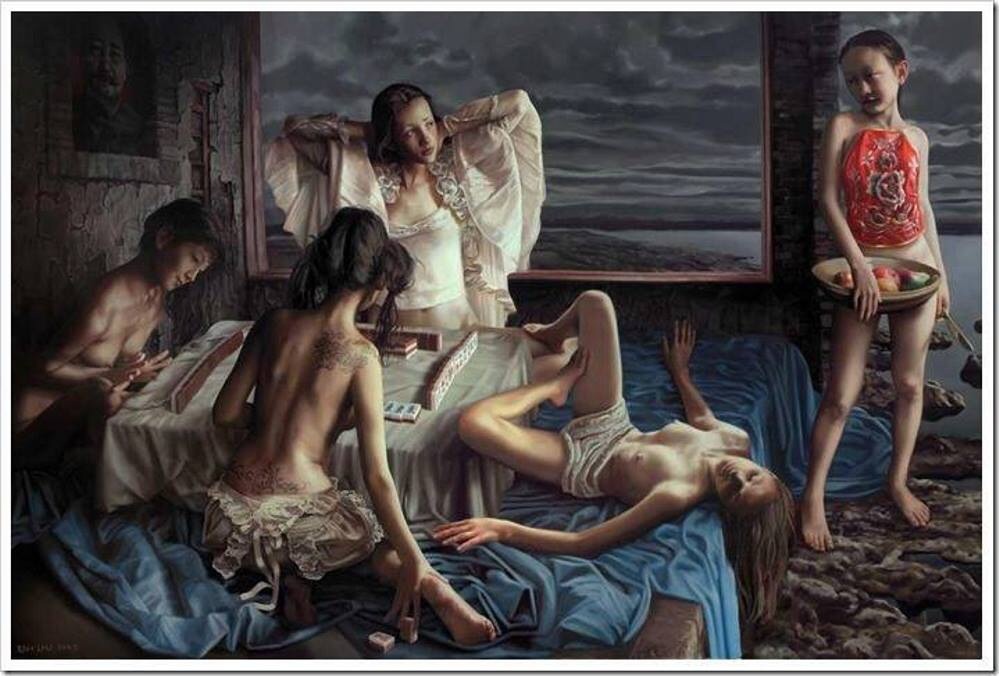 Bức tranh vẽ cảnh 5 cô gái, trong đó có 4 cô đang ngồi chơi mạt chược – trò chơi mà người TQ rất thích chơi và chơi rất giỏi. Luật chơi là người nào thua phải lần lượt lột đồ. Canh bạc diễn ra trong một căn phòng có cửa sổ nhìn ra bên ngoài là bầu trời biển Đông mây đen vần vũ, báo hiệu một cơn bão đang kéo đến. Trên tường treo ảnh một người đàn ông vừa lạ lại vừa quen, bạn tự nghĩ xem giống những ai nhé!