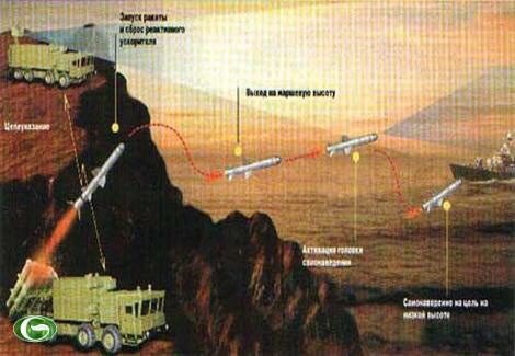 Về hệ thống dẫn đường, sau khi rời bệ phóng tên lửa P-800 sẽ bay theo chế dộ dẫn đường quán tính được lập trình sẵn. Ở giai đoạn tiếp cận mục tiêu, đầu tự dẫn radar chủ động (trên tên lửa) sẽ kích hoạt tìm kiếm, phát hiện mục tiêu ở khoảng cách 75km.