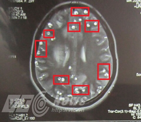 Cho phóng viên VTC News xem phim chụp não của một bệnh nhân bị nhiễm sán lợn, bác sỹ Trần Huy Thọ, Trưởng khoa khám bệnh chuyên ngành, Viện sốt rét – ký sinh trùng – côn trùng TW chỉ từng nang kén sán lợn làm tổ dày đặc trên não.