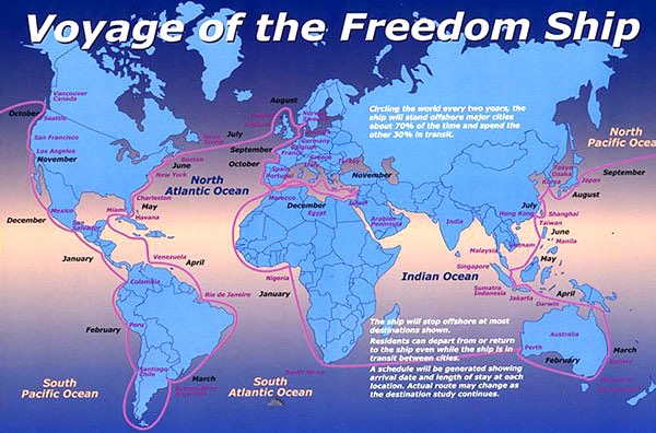 Đó là một thành phố thật đặc biệt bởi nơi đó người dân không chỉ được sống cuộc sống bình thường của họ mà còn được bồng bềnh trên mặt biển du ngoạn khắp đó đây trong thế giới bao la. Một công ty đóng tàu tại Miami, Florida đã thiết kế con tàu khổng lồ có sức chứa hơn 50,000 người. Con tàu có vốn đầu tư 10 tỷ đô la sẽ có nhiều công trình như trường học, bệnh viện, công viên, sòng bạc, phòng trưng bày, một sân bay trên mái có thể sử dụng được cho máy bay thương mại loại nhỏ 40-50 hành khách và các bến tàu để các tàu nhỏ có thể ra vào.