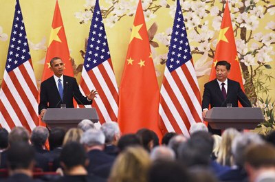 Tổng thống Mỹ Barack Obama (bên trái) và Chủ tịch Trung Quốc Tập Cận Bình trong một cuộc họp báo chung tại Đại lễ đường Nhân dân ở Bắc Kinh ngày 12 tháng 11 năm 2014.