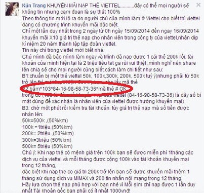 Cụ thể, lợi dụng sự cả tin và lòng tham của người dùng Facebook, kẻ gian đã đăng tải hàng loạt các status, bình luận “khoe” mình có “ông chú” làm ở Viettel và tiết lộ thông tin về chương trình khuyến mãi giá trị thẻ cào gấp 10, 20 lần.