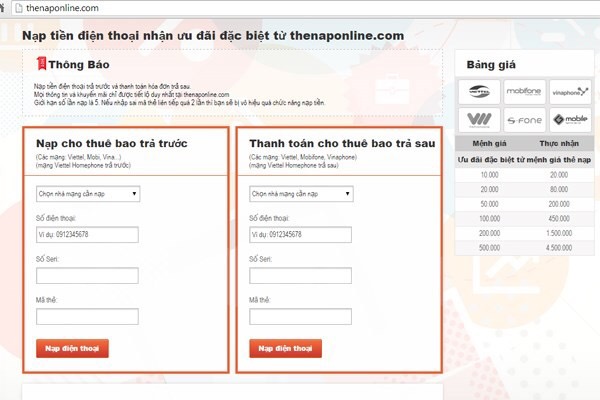 Website giả mạo có logo nhà mạng nhằm dụ người dùng điền mã trên thẻ cào