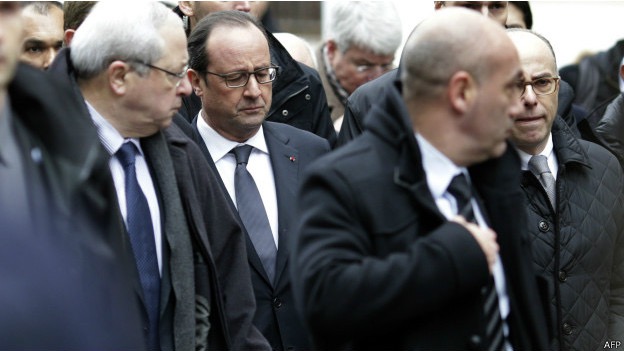 Tổng thống Francoise Hollande chau mày khi đến hiện trường vụ tấn công. Ông nói sẽ có cuộc họp khẩn cấp của nội các Pháp để bàn về tình hình an ninh quốc gia.