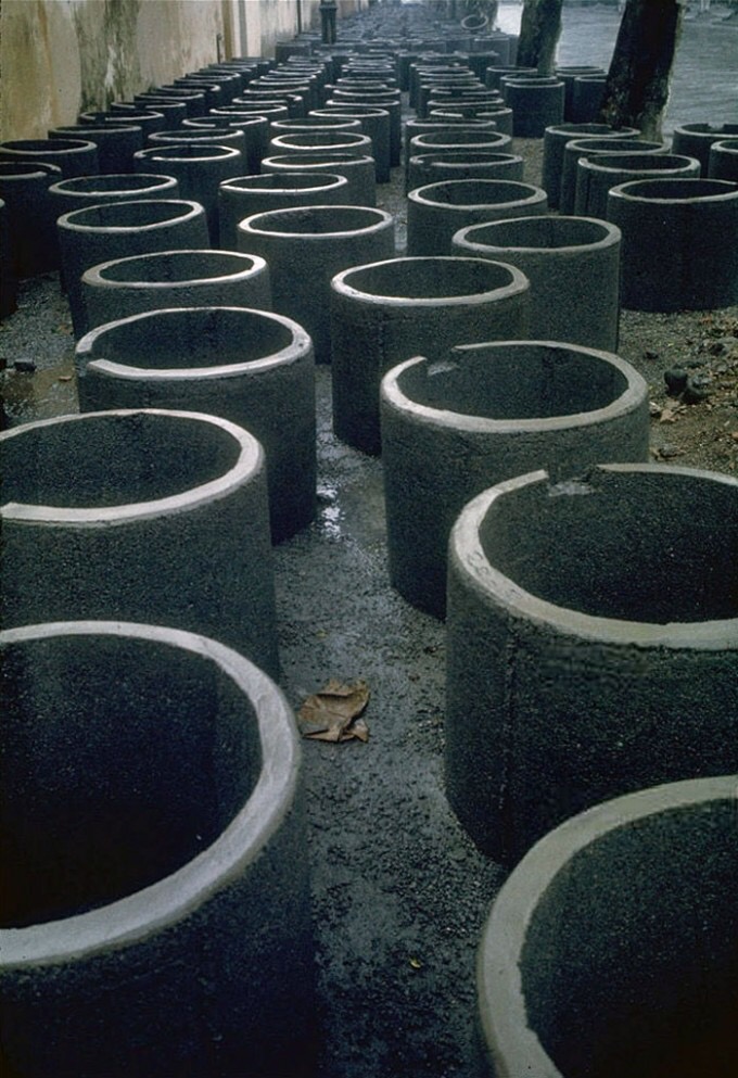 Ống bê tông dùng làm hố tránh bom cá nhân đặt trên lề đường phía trước xưởng sản xuất.