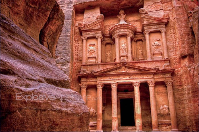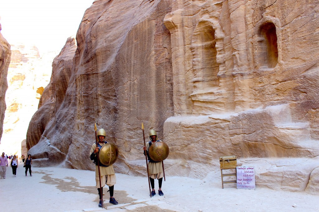 Con đường dẫn đến thành phố thông qua 1 khe núi chỉ rộng 2m với vách núi ở đây dựng đứng cao từ 80-100m 2 bên. Sau khi đi bộ khoảng 2km, vừa ra khỏi khe núi, phía trước mặt, hiện ra trước mắt tôi công trình có giá trị nhất ở Petra, Al Khazneh – có nghĩa là “Kho báu”, tạc dựng ngay vào sườn núi.
