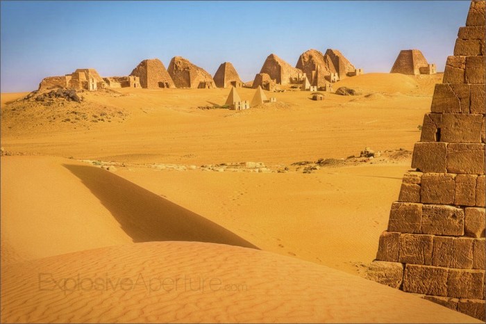 Có khoảng 40 kim tự tháp được xây dựng trên sa mạc ở Meroë, nằm trên vùng đất trước đây là Nubia, một vùng gồm nhiều quốc gia nhỏ nằm giữa Sudan và Ai Cập. Mặc dù chỉ thuộc dạng “tí hon” so với những kim tự tháp ở Ai Cập khi tòa tháp cao nhất cũng “chỉ có” 30m, tuy nhiên độ dốc của những kim tự tháp này cũng khiến người ta phải ngạc nhiên.