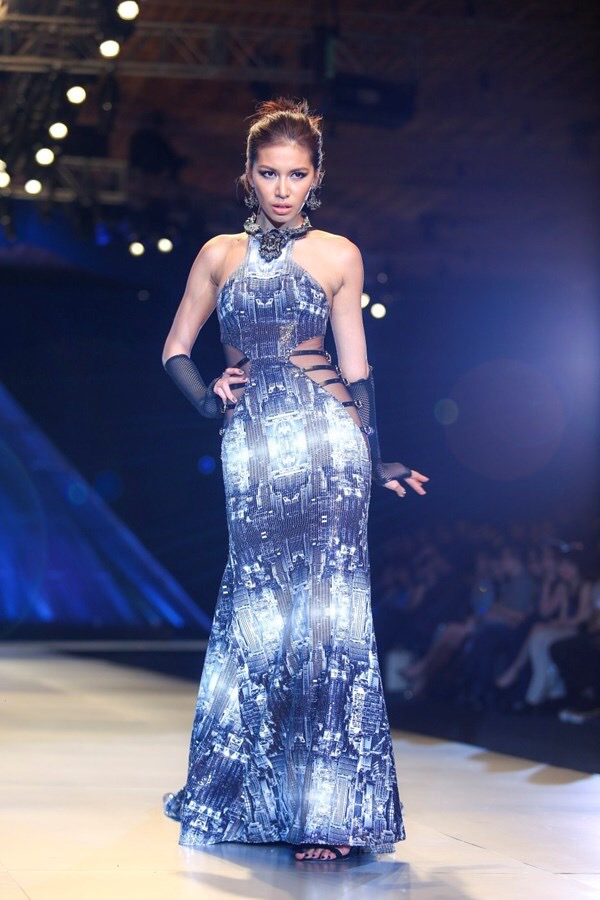 Chung Thanh Phong thì chế tạo ra chiếc nón mang phong cách vị lai có nan kim loại màu vàng ánh kim phối cùng với trang phục gắn sequin, cut lazer .