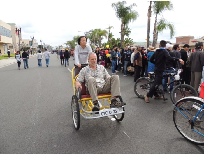(Chú thích thêm của Đ V Chương: thỉnh thoảng trong vài bưổi lễ hội tại Hoa Kỳ,xích lô đạp lại xuất hiện ở Bolsa-Orange Conty-California mà tôi- Đ V Ch – chụp được dưới đây nhân dịpTết Ất Mùi 2015, người đội cap trắng, mang kiếng trắng đứng kế xe xích lô là Hiền Thê của tôi)
