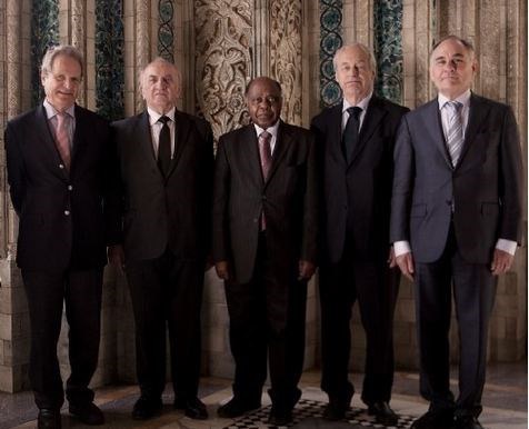 | Tòa án Quốc tế được thiết lập tại Hội nghị Hague năm 1899 để giải quyết tranh chấp quốc tế bằng hòa bình. Trong hình là 5 thẩm phán thụ lý vụ Philippines kiện Trung Quốc. |