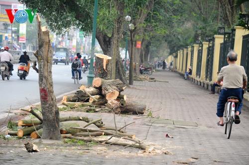 Theo khảo sát của nhóm phóng viên, đến ngày 19.3, việc chặt hạ cây xanh trên nhiều tuyến phố Lê Duẩn, Quang Trung, Nguyễn Chí Thanh… vẫn được tiếp tục, lượng cây bị đốn đã khá nhiều. Tại đường Lê Duẩn, Quang Trung, dấu tích còn lại chỉ là các thân cây trơ trọi phần gốc hoặc những hố được lấp đất tạm bợ. Thân, cành các cây này đều đã được di chuyển đi nơi khác.