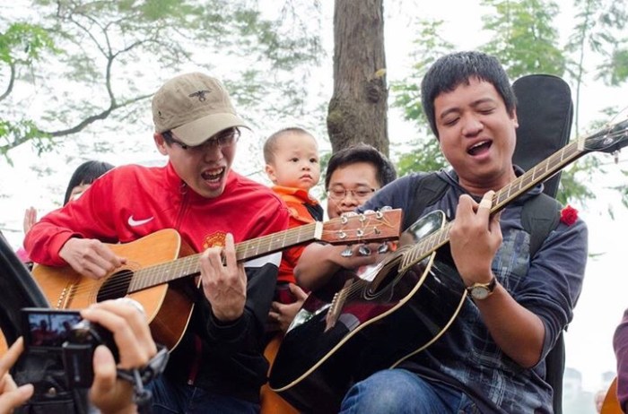 Đám đông đang hát vang, với sự hưởng nhiệt tình.