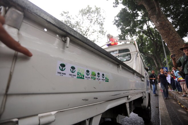 Xe ô tô cảnh sát làm nhiệm vụ được một số người dán khẩu hiệu “gìn giữ cây xanh”.
