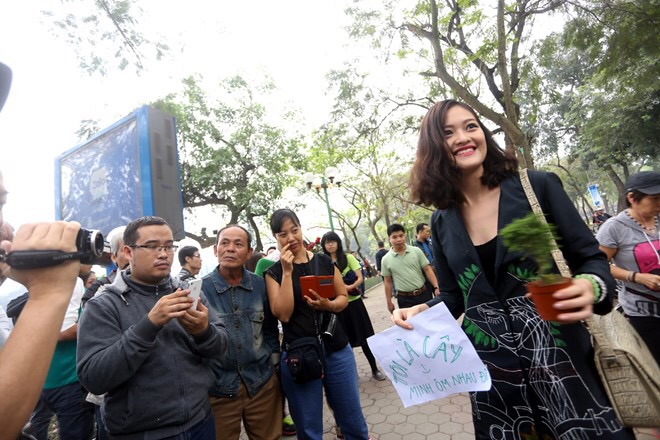 Diễn viên Thùy Anh với trang phục cây, tay cầm cây cũng diễu hành vòng quanh Hồ Thiền Quang.