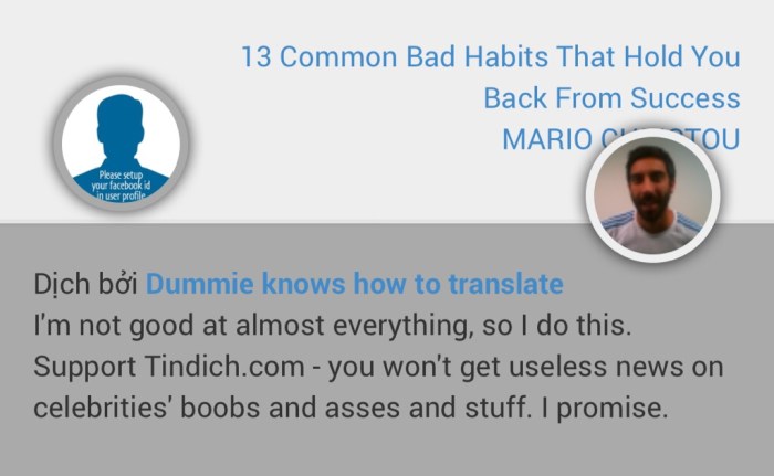 Việc hình thành thói quen gắn liền với thành công của bạn. Điều đó là hoàn toàn chắc chắn. Hình thành những thói quen lâu bền phù hợp với con người bạn chính là điều cần thiết để bạn có thể vươn đến thành công trong bất cứ lĩnh vực nào của cuộc sống. Tạo lập thói quen tốt cho bạn sẽ thật sự tốt, nhưng liệu bạn đã từng ngẫm lại và đánh giá một cách trung thực xem điều gì đã và đang cản trở bước tiến thành công của bạn?