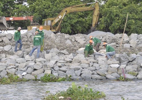 Sông Đồng Nai đang được gấp rút kè bờ, san lấp một phần để làm khu thương mại. Ảnh: Tuấn Kiệt