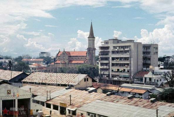 Tháng 11/1968. Nhà thờ Huyện Sĩ nhìn từ khách sạn Walling. Phía dưới tấm ảnh là doanh trại của đơn vị tâm lý chiến số 4.