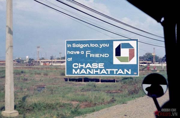 Tháng 11/1968. Biển quảng cáo của ngân hàng Chase Manhattan phía bên ngoài trụ sở MACV (Bộ chỉ huy Viện trợ Quân sự Mỹ tại Việt Nam).