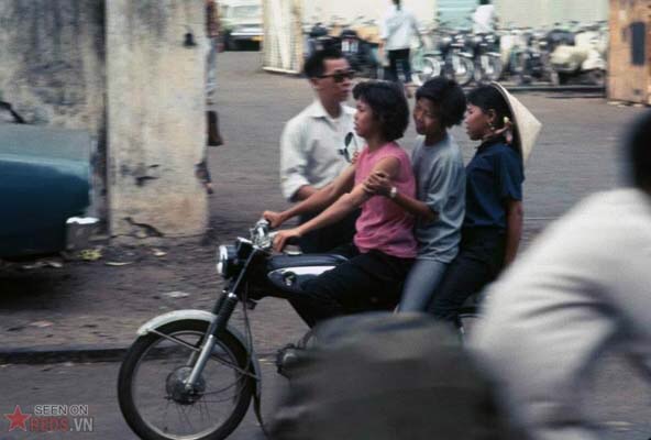 Tháng 12/1968. Một chiếc xe máy kẹp 3 trên đường phố.