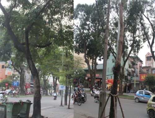 Chú Nguyễn Hữu Trung (56 tuổi) là bảo vệ của Phòng khám mắt ngay cạnh Bộ Y tế cho biết: “Ngay sau Tết Nguyên Đan chúng tôi đi làm thấy người ta đang rục rịch chặt hạ các cây ở đây rồi, trong khi chúng vẫn còn xanh tốt. Có cây to vừa ôm tay người thế nhưng cũng đều bị chặt hạ.