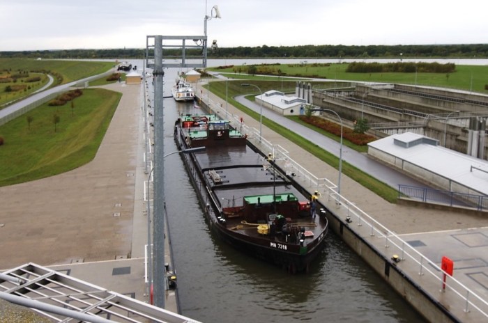 Kênh đào Elbe-Havel và Mittelland trước đây gặp nhau gần Magdeburg nhưng ở phía bên kia của sông Elbe, ở độ cao thấp hơn đáng kể so với hai kênh. Tàu di chuyển đường vòng giữa hai kênh có chiều dài 12 km (7,5 dặm), giảm dần từ kênh đào Mittelland thông qua nhấc lên tàu Rothensee vào sông Elbe, sau đó đi thuyền về phía hạ lưu sông, trước khi lên kênh đào Elbe-Havel qua Niegripp. Mực nước thấp ở sông Elbe ngăn cản sà lan vận chuyển hàng hóa đi qua, nó cần nhiều thời gian để bốc xếp hàng.