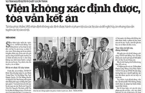 Tuy nhiên, 12 cây tràm bị chặt hạ, tám người bị ra tòa, năm người bị tù giam, còn lại cũng bị án tù nhưng được hưởng án treo. Cứ nhìn vào “đội ngũ” bị cáo đứng trước tòa và nội dung vụ án thì thấy có cả bà già tóc bạc, còn lại đều là những người còn rất trẻ, mới thấy thương xót cho những người dân thấp cổ bé họng!