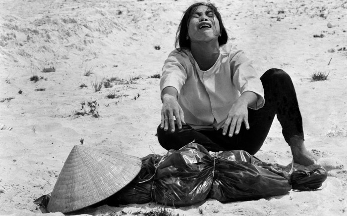 A woman mourns over the body of her husband after identifying him by his teeth, and covering his head with her conical hat. The man’s body was found with forty-seven others in a mass grave near Hue, April 11, 1969. The victims were believed killed during the insurgent occupation of Hue as part of the Tet Offensive.