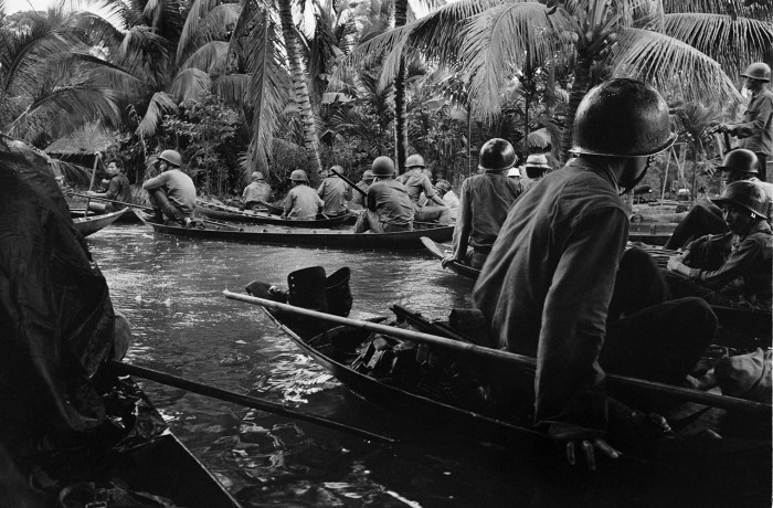 Caught in a sudden monsoon rain, part of a company of about 130 South Vietnamese soldiers moves downriver in sampans during a dawn attack on a Viet Cong camp, January 10, 1966. Several guerrillas were reported killed or wounded in the action thirteen miles northeast of Can Tho, in the flooded Mekong Delta.