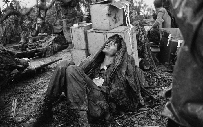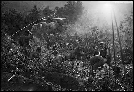 First: A U.S. paratrooper wounded in the battle for Hamburger Hill grimaces in pain as he awaits medical evacuation at base camp near the Laotian border, May 19, 1969.  U.S. Marines emerge from their foxholes south of the DMZ after a third night of fighting against North Vietnamese troops, September 1966. The helicopter at left was shot down when it came in to resupply the unit