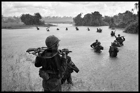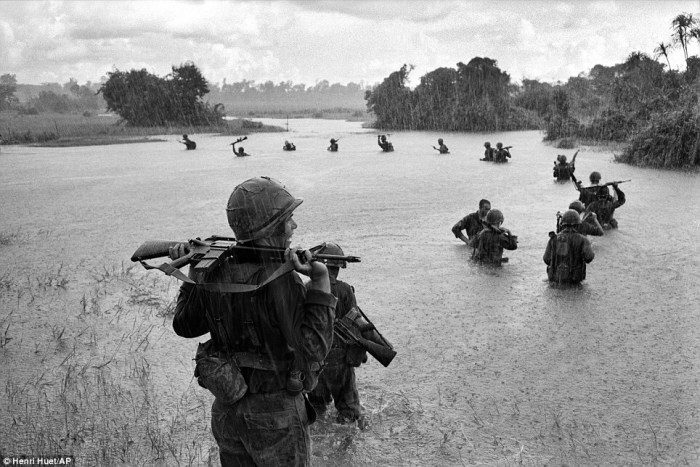 Henri Huet, the French war photographer who took this powerful image, died in 1971 when the helicopter he and three other photojournalists were in was shot down. It shows U.S. paratroopers of the 2nd Battalion, 173rd Airborne Brigade, hold their automatic weapons above water as they cross a river in the rain during a search for Viet Cong positions in the jungle area of Ben Cat, September 25, 1965