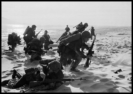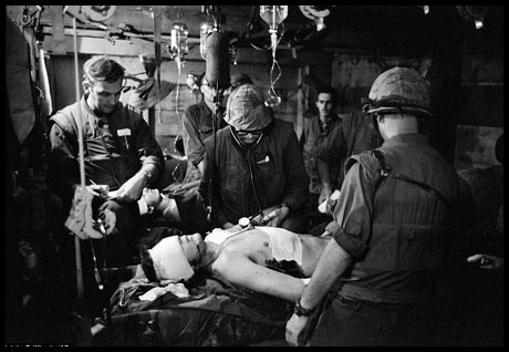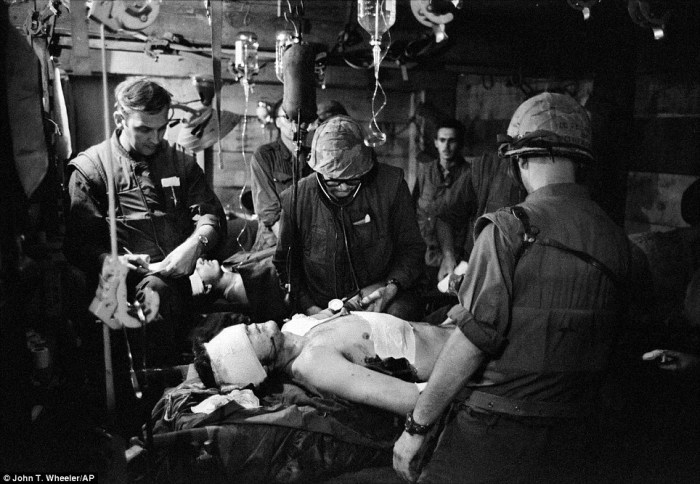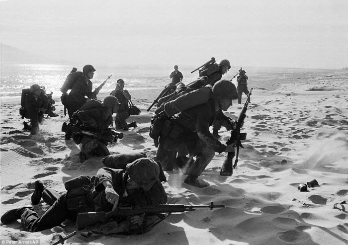 Dr. Joseph Wolfe, center, treats a wounded soldier while other physicians attend at Charlie Med, a makeshift underground hospital at the besieged Khe Sanh Marine base, March 1968   The above picture, by New Zealand journalist Peter Gregg Arnett, shows freshly landed U.S. Marines make their way through the sands of Red Beach at Da Nang, April 10, 1965