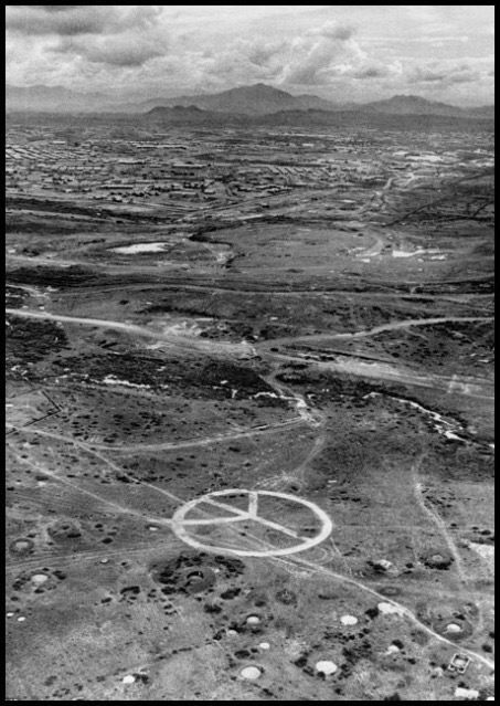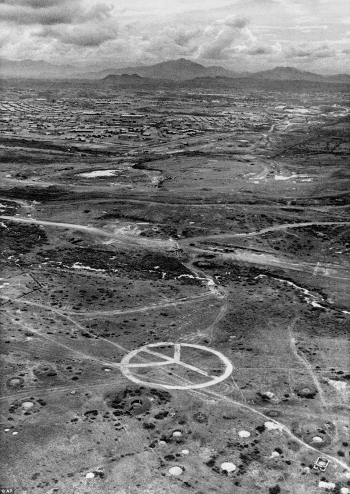 An aerial image shows a large peace sign, apparently gouged out of the countryside with a bulldozer, near Camp Eagle, headquarters of the 101st Airborne Division, in the northern part of South Vietnam, May 8, 1971