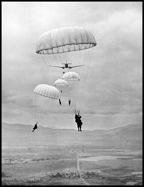 French paratroopers descend on the fortified outpost at Dien Bien Phu to provide reinforcements for soldiers trying to hold out against a siege by the Viet Minh, March 16, 1954
