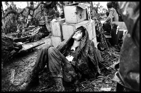 Sunlight breaks through dense foliage around the town of Binh Gia as South Vietnamese troops, joined by U.S. advisers, rest after a cold, damp, and tense night of waiting in an ambush position for a Viet Cong attack that did not come, January 1965. One hour later, the troops would move out for another long, hot day hunting the guerrillas in the jungles forty miles southeast of Saigon.