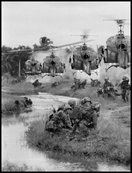 This photograph was taken by German photojournalist and two-time Pulitzer Prize winner Horst Faas. It shows hovering U.S. Army helicopters pour machine-gun fire into the tree line to cover the advance of South Vietnamese ground troops as they attack a Viet Cong camp eighteen miles north of Tay Ninh, near the Cambodian border, March 1965