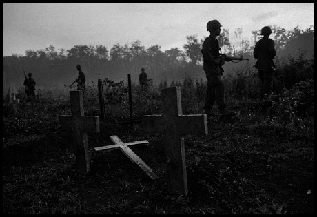 Tháng 12/1967. Lính Mỹ canh phòng vòng ngoài khu căn cứ quân sự Bù Đốp ở tỉnh Bình Phước. Nơi đây có một số ngôi mộ của lính Mỹ tử trận. Có những cây thập tự ngã chỏng chơ, nhiều cây khác bị sứt mẻ bởi những cuộc tấn công bằng đạn cối và đạn ghém của quân du kích