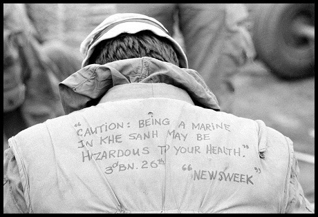 Lời nhắn viết trên áo trấn thủ của một Lính Mỹ, thể hiện sự ám ảnh của anh ta trước mức độ ác liệt của chiến trường Khe Sanh: “Cảnh báo: Làm Lính Thủy Đánh Bộ ở Khe Sanh là một trải nghiệm có hại cho sức khỏe.