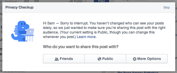 Trang mạng xã hội nổi tiếng này đang thử nghiệm một kiểu pop-up cảnh báo mới để nhắc nhở người dùng chú ý hơn tới những người mà họ chia sẻ nội dung trên trang cá nhân thông qua hình ảnh Chú Khủng Long Bảo Mật – một chú khủng long hoạt hình với chiếc laptop trên tay.
