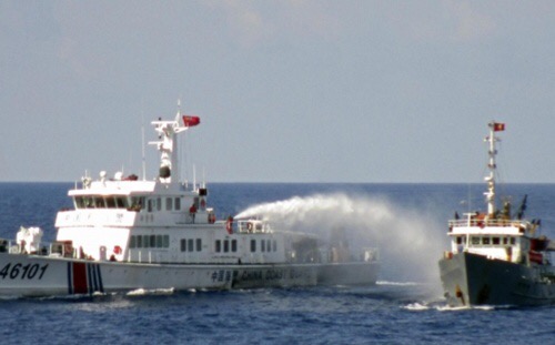 Tàu hải cảnh Trung Quốc hồi giữa năm ngoái phun vòi rồng vào tàu cảnh sát biển Việt Nam gần giàn khoan Hải Dương 981 mà nước này hạ đặt trái phép trong vùng đặc quyền kinh tế và thềm lục địa của Việt Nam trên Biển Đông. Ảnh: Reuters