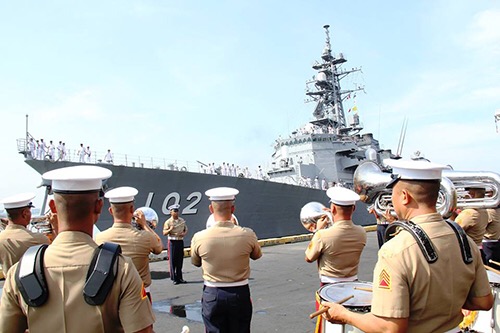 Hải quân Philippines hôm 9/5 trong lễ đón hai tàu khu trục Nhật Bản tại cảng Nam Manila. Ảnh: Philippines Navy