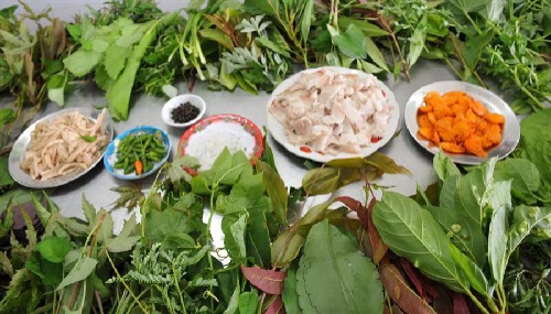Ăn gỏi lá cũng là “ăn thuốc”, bởi có nhiều loại lá cây rất tốt cho sức khỏe như đinh lăng, ngũ gia bì, lá mơ, xoài rừng, lá lê rừng, lá hồng ngọc… Một điều rất thú vị là do không thể nào cùng lúc ăn 60 loại lá trong một cuốn gỏi nên mỗi cuốn sẽ cho thực khách một hương vị riêng, tùy theo đã chọn gói lá gì.