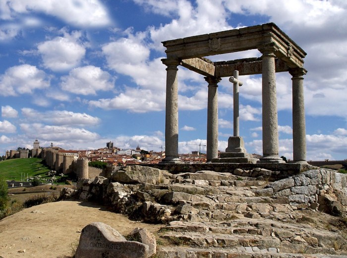Tuy nhiên, có điều tôi không hiểu mục đích của cổ thành Ávila được xây dựng để bảo vệ người dân Ávila hay chỉ để nhằm bảo vệ đức tin Thiên Chúa giáo trước sự xâm lấn của đức tin Hồi Giáo, hai tôn giáo mà lúc nào cũng sẵn sàng triệt tiêu đức tin của nhau. Phải chăng chính vì thế mà hình tượng Thánh Giá nằm giữa bốn cột trụ trên đỉnh đồi Los Cuatro Postes đã trở thành biểu tượng cho cổ thành Ávila, để chứng minh sự hiện diện của đức tin Kitô tại Ávila. Ðọc thông tin của thành phố Ávila, người ta cho biết bên trong thành nội có 36 điểm du ngoạn thì đã có đến 19 điểm là nhà thờ và tu viện. Phần còn lại là các di tích cung điện của giới quí tộc và một vài nhà bảo tàng nhỏ được trùng tu vào những thập niên gần đây.