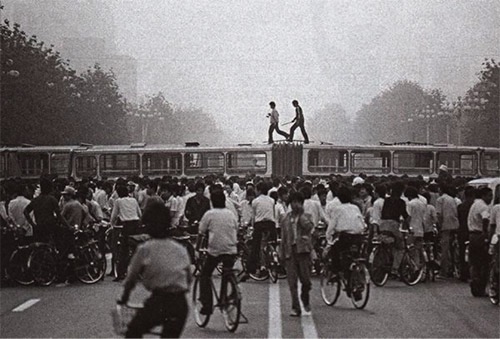 Để chặn quân đội lại, tài xế xe buýt để xe của họ nằm ngang qua trên các đại lộ của Bắc Kinh và xì lốp xe. Ảnh: GEO Epoche