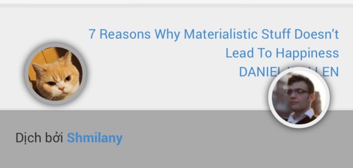 Có đồ mới sẽ mang đến sự hài lòng nhất thời, chắc chắn rồi, nhưng hạnh phúc lâu dài? Không hẳn đâu. Sở hữu mẫu iPhone mới nhất có thể sẽ rất tuyệt, nhưng hãy yên tâm rằng thậm chí mẫu mới hơn (và tốt hơn) sẽ ra mắt. Rồi những thứ mà bạn sở hữu sẽ luôn có những mẫu khác tốt hơn, vì vậy hãy bỏ nhu cầu phải có thứ mới-nhất-và-tốt-nhất-đi và bạn sẽ hạnh phúc với những gì mà mình có.